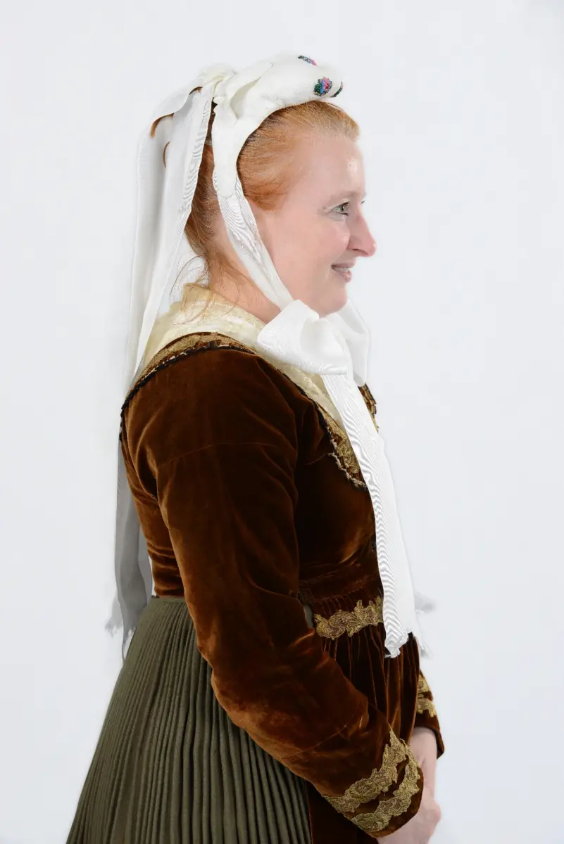 Bei der Tracht der Frau ist am auffälligsten die kleine weiße Kappe, die auf der Vorderseite mit zwei perlenbestickten Blümchen verziert ist. Ein identisches befindet sich in der Mitte der oberen Hälfte des Rückteils. An beiden Seiten sind Bänder angebracht, die in der Regel aus weißem Moireband waren und unter dem Kinn zu einer Schleife gebunden werden. Auch am faltigen Rückenteil der Kappe hängt eine gleichartige Schleife über den Rücken herab, an deren Ende ein Schwalbenschwanzmuster eingeschnitten ist.