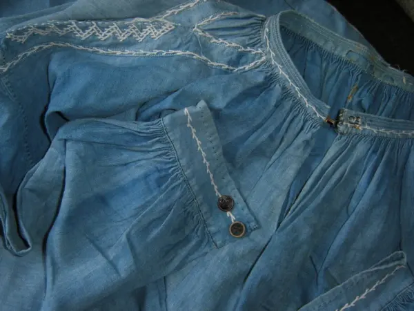 Der Kittel wurde aus blauem Leinen gefertigt und reichte bis zur Hüfte. An Schulter und Ärmelbündchen wurden Falten gezogen „eingelesen“. Schulterpasse und Ärmelbündchen waren mit einer schlichten Weißstickerei verziert.