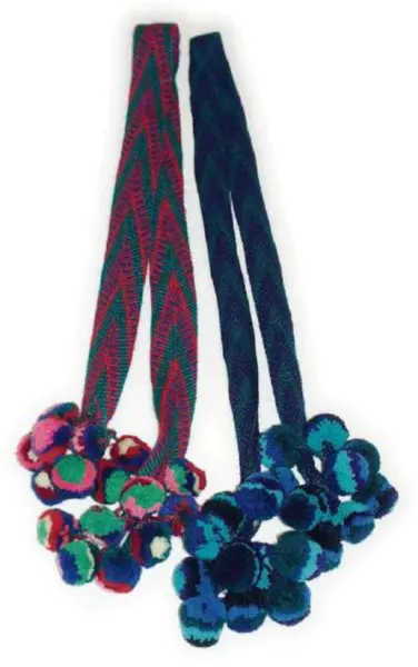 Eine hübsche farbige Ergänzung bildeten die bunten“ Strumpfbänder“, auch „Strumpfbennel“ oder „Hessebennen“ genannt. Die Strumpfbänder wurden aus gekauftem, buntem Wollgarn geflochten. Man verflocht die Fäden zu einem zopfähnlichen Band mit schrägkreuzendem Muster. Die Bänder waren ungefähr 1 Meter lang und 3 cm breit und gingen an beiden Enden in 8-10 kleine Zöpfe über, an deren Ende jeweils eine kugelartige Bommel (Quast) hing. Man wickelte das Strumpfband unterhalb des Knies mehrmals um das Bein und verschlang die Enden so, dass die Bommeln vorne oder leicht seitlich unter dem Faltenrock hervor sahen. Auch die Farbenordnung spielte bei den „Hessebennen“ eine Rolle. So trugen junge Mädchen und unverheiratete Frauen rot-grüne oder manchmal auch ganz bunte, rot-grün / gelb-violett. Bei verheirateten Frauen waren diese Strumpfbänder nur in blau-grün oder grün-violett gehalten. Bei Trauer verschwand das Rot.